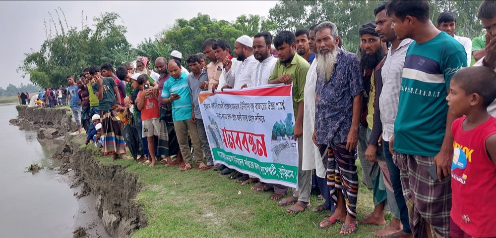 কুড়িগ্রামের নাগেশ্বরী উপজেলার বামনডাঙ্গা ইউনিয়নের কুটিরচর এলাকায় ৩ কিলোমিটার এলাকাজুরে দেখা দিয়েছে দুধকুমার নদের প্রবল ভাঙ্গন। ভাঙ্গনের মুখে রয়েছে মসজিদ, মাদরাসা, শিক্ষা প্রতিষ্ঠান, বসভিটাসহ নানা স্থাপনা। ভাঙ্গনে নিঃশ্ব হচ্ছেন ওই এলাকার শতশত পরিবার। ঠাঁই হারিয়ে দিশাহারা পরিবারগুলোর দাবি দ্রুত ভাঙ্গন রোধে দ্রæত ব্যবস্থা না নিলে স্ত্রী সন্তান নিয়ে পথে বসতে হবে তাদের। এছাড়াও ভাঙ্গন আতঙ্কে দিশাহারা নদীপাড়ের মানুষ। তাই ভাঙ্গন রোধে দ্রত ব্যবস্থা নেয়ার দাবিতে বন্ধু বাজার সংলগ্ন নদী তীরে দাঁড়িয়ে মঙ্গলবার (১০ সেপ্টেম্বর) বেলা ১১টায় মানববন্ধন করেছেন ওই ইউনিয়নের শতাধিক মানুষ। এ সময় বক্তব্য রাখেন বামনডাঙ্গা ইউনিয়ন পরিষদের চেয়ারম্যান আসাদুজ্জামান রনি, ইউনিয়ন বিএনপির যুগ্মআহ্বায়ক মিনারুল ইসলাম, সদস্য সচিব সাইফুর রহমান, সাবেক সভাপতি সেকেন্দার আলী, ইউপি সদস্য বাবুল মিয়া, ইউনিয়ন যুবদলের যুগ্ম আহ্বায়ক মোশারফ হোসেন, স্থানীয় আজিজুল হক, কন্ট্রাক্টর, মহির গোয়াল, আব্দুল খালেক প্রমুখ।
