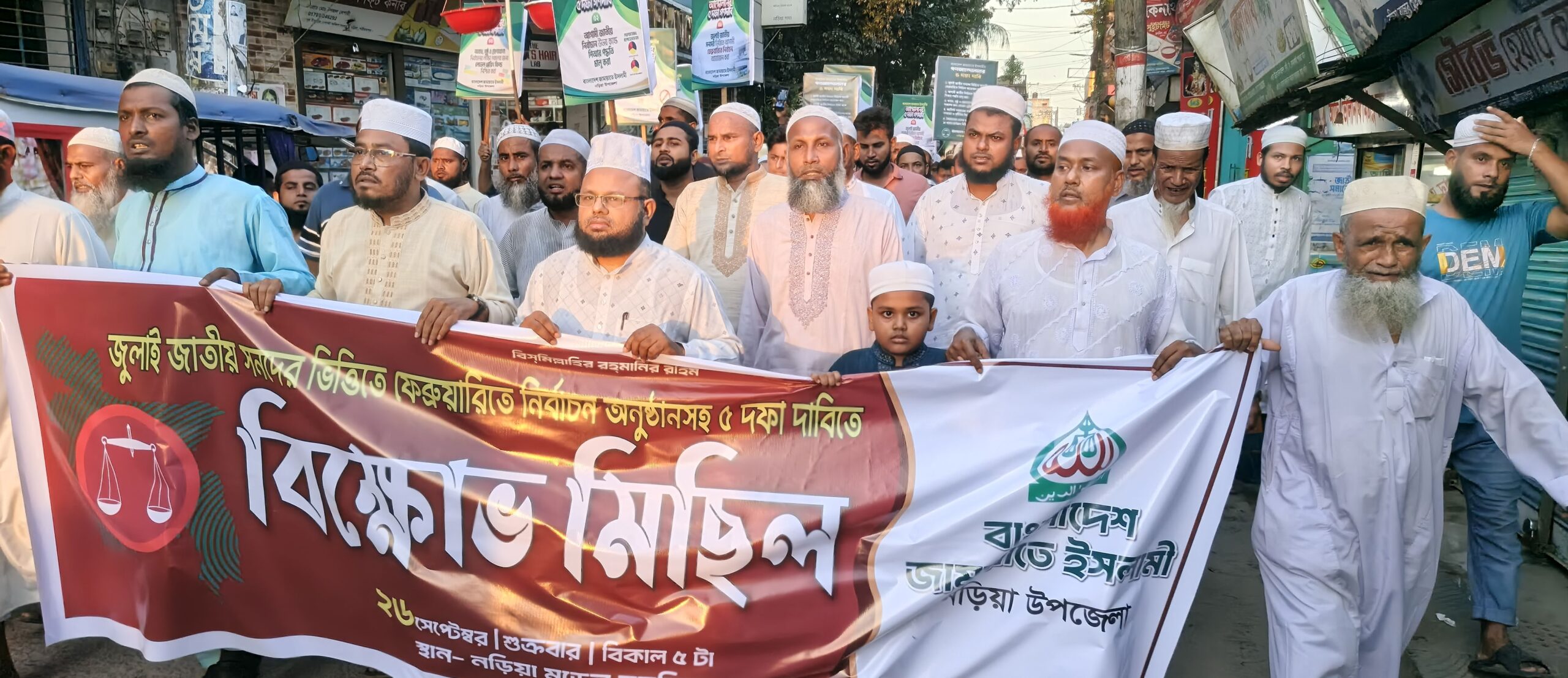 শরীয়তপুরে নড়িয়ায় জুলাই সনদের আইনি ভিত্তি দিয়ে পিআর পদ্ধতিতে ফেব্রুয়ারিতে নির্বাচন সহ পাঁচ দফা দাবিতে বিক্ষোভ মিছিল ও সমাবেশ করে নড়িয়া উপজেলা জামায়াতে ইসলামী।