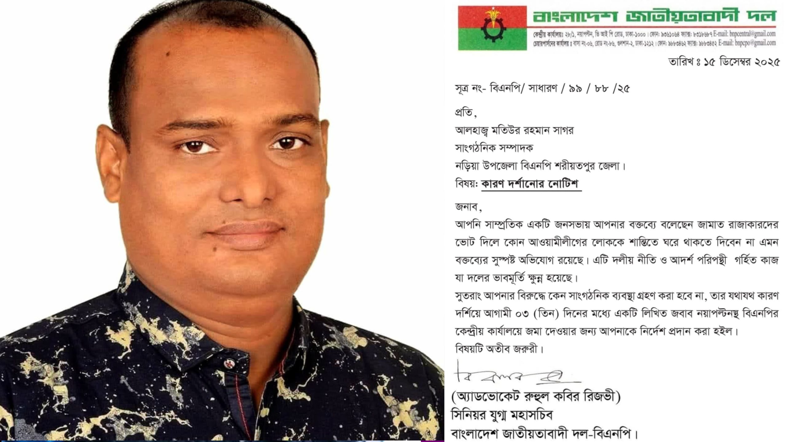 ভাইরাল ভিডিও নিয়ে নড়িয়া উপজেলার বিএনপি নেতা মতিউর রহমান সাগরকে কেন্দ্রীয় কার্যালয়ের কারণ দর্শানোর নোটিশ।