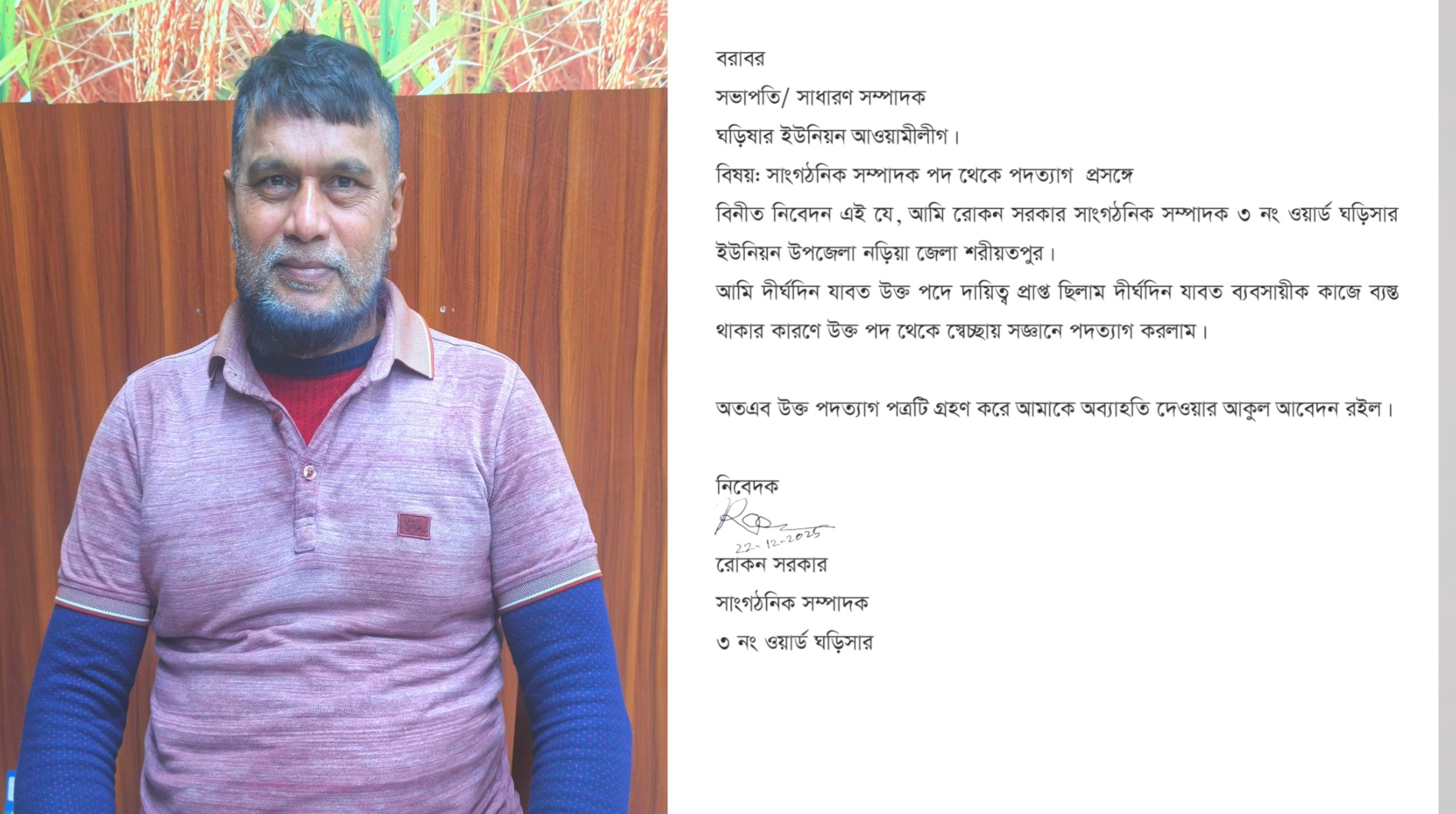 শরীয়তপুরের নড়িয়া উপজেলার ঘড়িষার ইউনিয়নের ৩নং ওয়ার্ড আওয়ামী লীগের সাংগঠনিক সম্পাদক পদ থেকে স্বেচ্ছায় পদত্যাগ করেছেন রোকন সরদার নামক এক আওয়ামীলীগ নেতা।