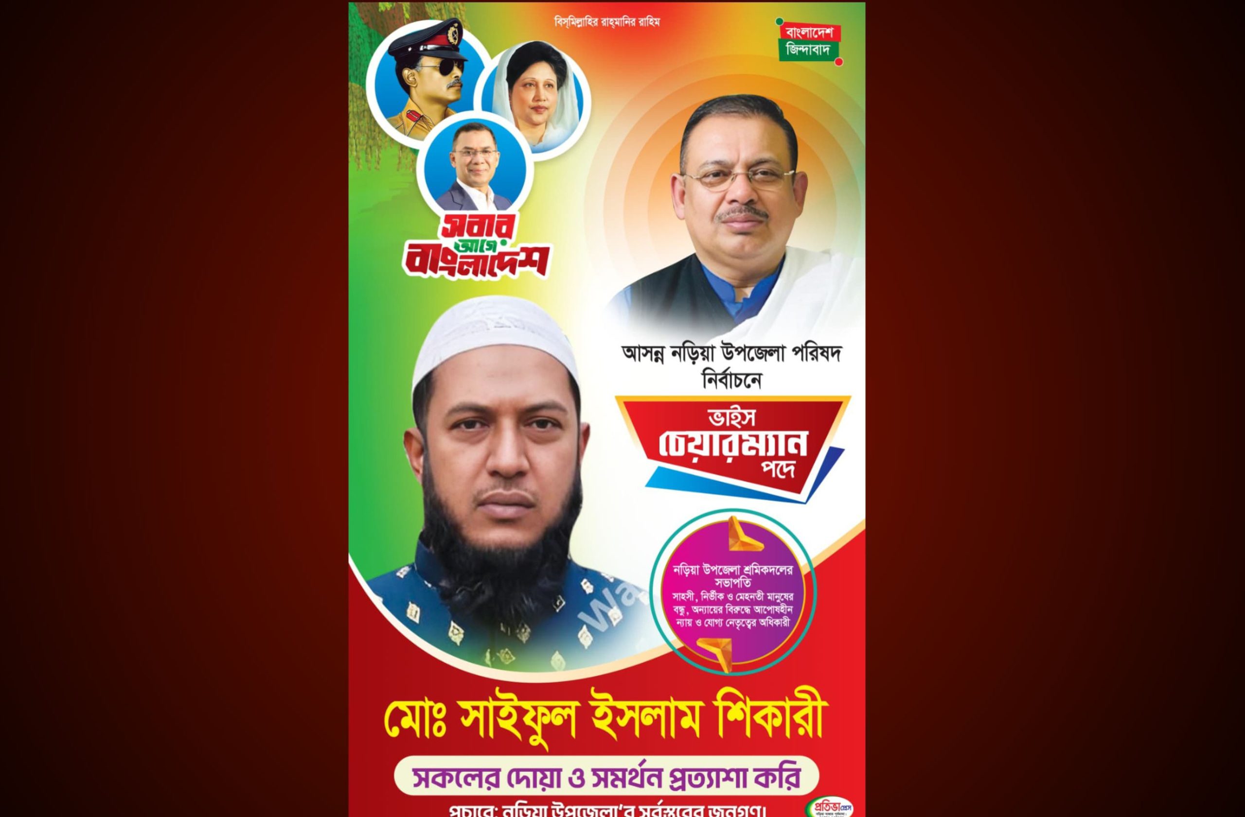 শরীয়তপুর নড়িয়া উপজেলা পরিষদের আসন্ন নির্বাচনে ভাইস চেয়ারম্যান পদে প্রার্থী হওয়ার ঘোষণা দিয়েছেন মোঃ সাইফুল ইসলাম শিকারী। নির্বাচনকে সামনে রেখে তিনি উপজেলার সর্বস্তরের জনগণের কাছে দোয়া ও সমর্থন কামনা করেছেন।