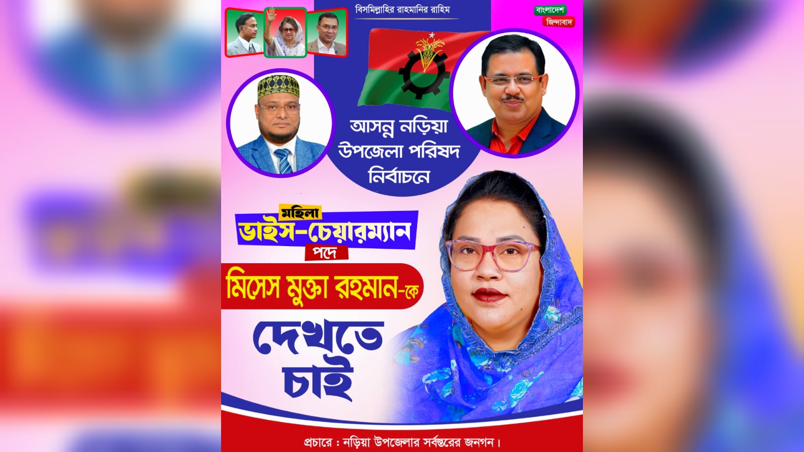 নড়িয়া উপজেলা পরিষদ নির্বাচনে মহিলা ভাইস চেয়ারম্যান পদে দোয়া ও সমর্থন প্রত্যাশী: মিসেস মুক্তা রহমান।