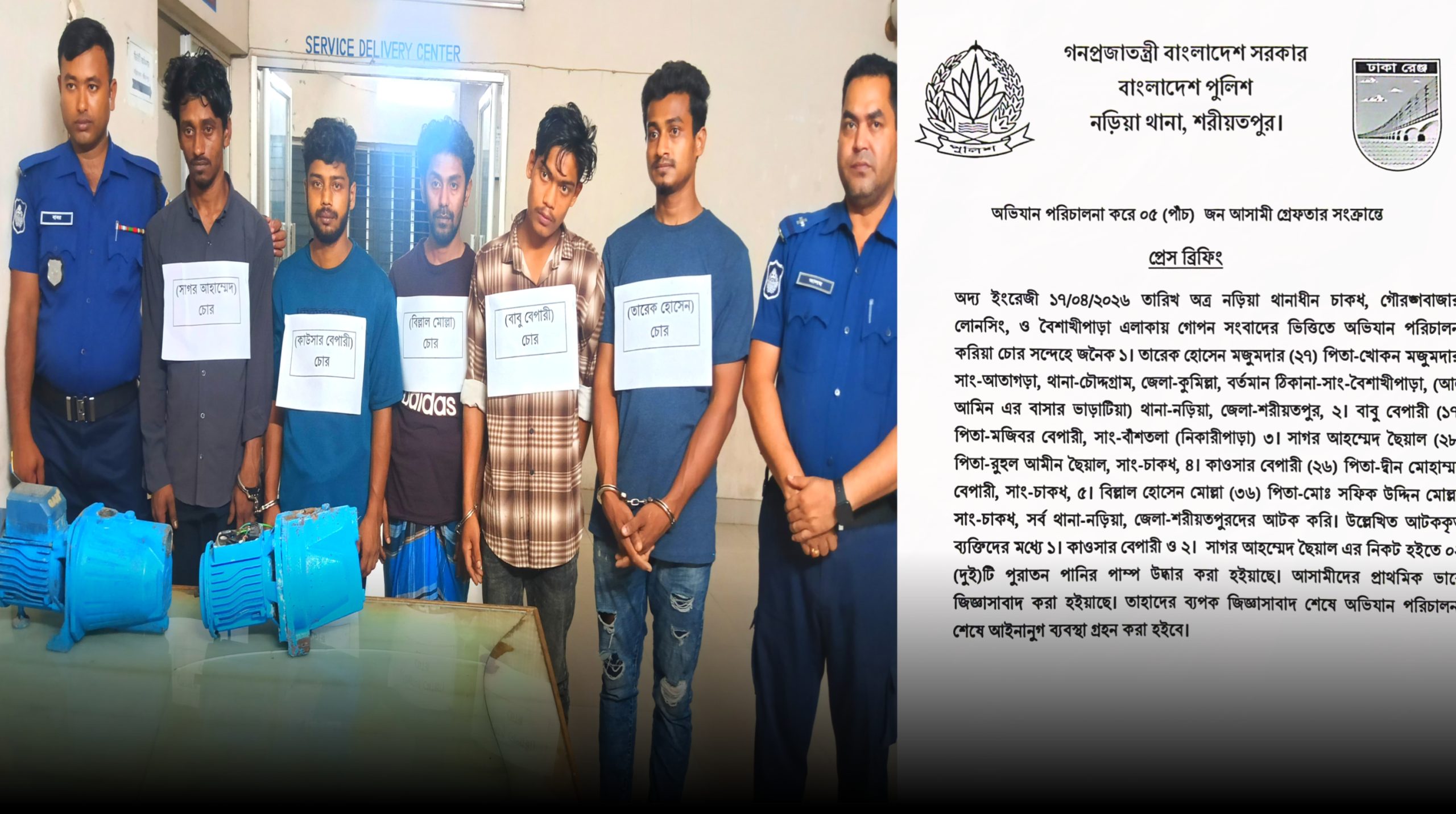 নড়িয়ায় পুলিশের অভিযানে উদ্ধার চোরাই পানির পাম্পসহ গ্রেফতার ৫